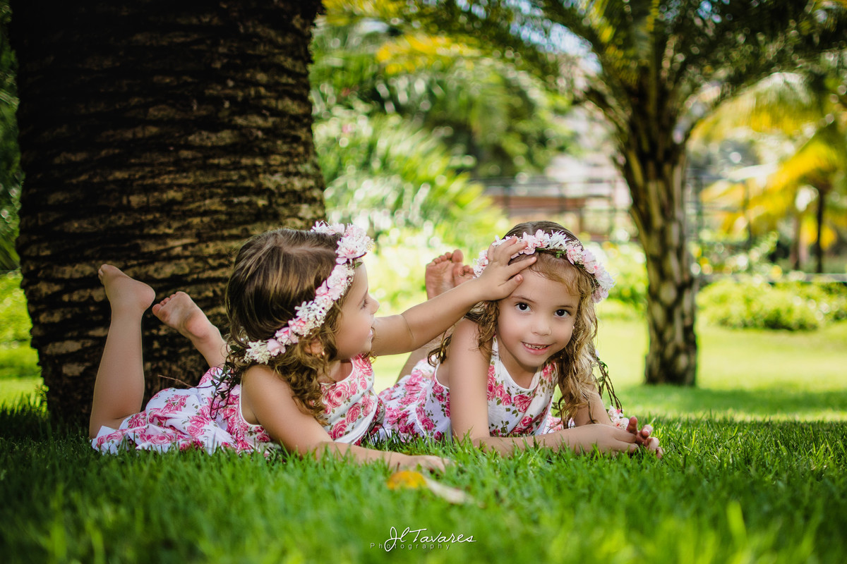 irmãs abraçadas e fazendo carinho uma a outra entre arbustos non rio 2 park posando pára ensaio infantil. Barra da Tijuca/RJ