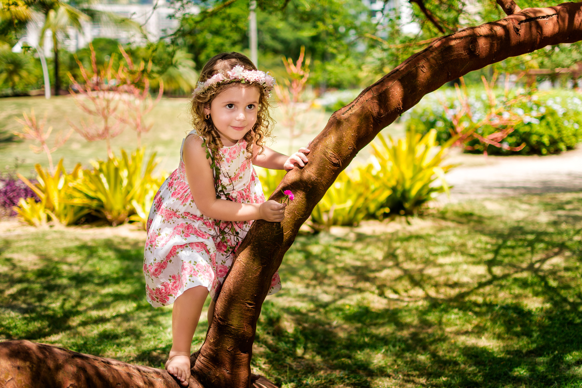 foto do ensaio infantil da Isabela, vestindo vestido branco, uma tiara de flores e descalça!