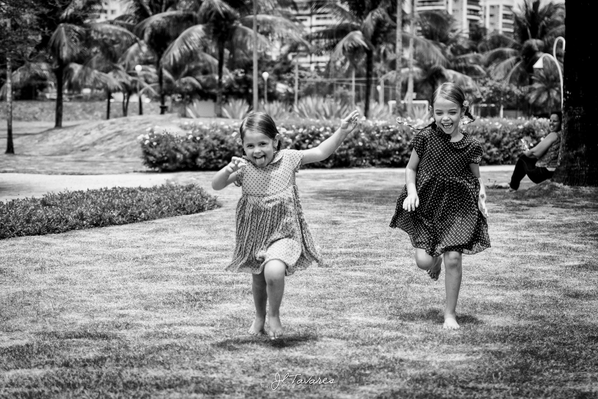 foto de duas crianças correndo no gramado durante ensaio fotográfico infantil